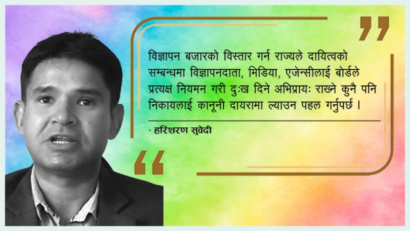 विज्ञापन बजारको विस्तार गर्न राज्यले यतिमात्रै गरेर पुग्दैन, दायित्वको सम्बन्धमा विज्ञापनदाता, मिडिया, एजेन्सीलाई बोर्डले प्रत्यक्ष नियमन गरी दु:ख दिने अभिप्राय राख्ने कुनै पनि निकायलाई कानूनी दायरामा ल्याउन पहल गर्नुपर्छ । पीआरको गलत फाइदा उठाई केही विज्ञापनदाता तथा मिडियाले सीमित समयका लागि लाभ लिए पनि अन्तत: यसले विज्ञापनको बजार घटाएको छ, यसको नियमन जरुरी छ ।