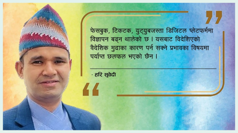 २ अर्बको विज्ञापन बजारलाई डिजिटल बजारले चुनौती दिन थालेको अवस्था छ । फेसबुक, टिकटक, युट्युबजस्ता डिजिटल प्लेटफर्ममा विज्ञापन बढ्न थालेको छ । विदेशिएको वैदेशिक मुद्राबाट विदेशी विनिमय सञ्चितिमा परेको प्रभावका विषयमा पर्याप्त छलफल भएको छैन । यसलाई सरकारले नियन्त्रण गर्न सकेको पनि छैन । अन्जानमै टेलिभिजन व्यवस्थापकहरूले आफ्ना कन्टेन्टहरू सामाजिक सञ्जालमा सहज रूपमा उपलब्ध गराउँदा समस्या थपिएको छ । त्यसैले टेलिभिजनहरूले आफ्ना मौलिक निर्माणहरू सामाजिक सञ्जालमा जानबाट रोक लगाउन आवश्यक छ । कन्टेन्ट हेर्न शुल्क तिर्नुपर्ने गर्न सकियो भने थप आम्दानी पनि हुने थियो । कपी राइट, पेटेन्ट राइट, बौद्धिक सम्पत्तिको अधिकारका लागि पहल गर्न सकेको खण्डमा टेलिभिजन उद्योग थप बलियो हुने थियो ।